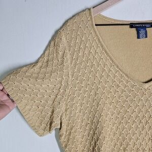 Key features: tan slinky knit sweater, short sleeve, v-neck, orange beaded floral detail at the neckline
