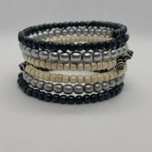 Boho Beaded Wrap Bracelet Stackable Black Silver Cream Zebra Accent