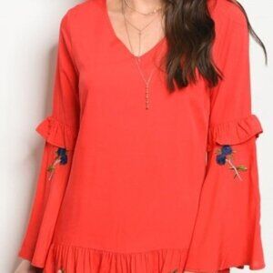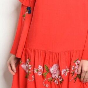 Beautiful Boho Red Long Bell sleeve floral embroidery detail tunic dress. Perfect for the season, so comfortable, easy to slip on and go!
