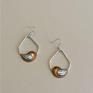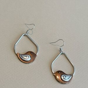 Charming silver and rose gold bird earrings perfect for any occasion. These elegant earrings add a touch of whimsy to your style.