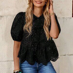 Boho Black Modern Front Tie Puff Sleeve Embroidery Elegant Blouse, Vacation