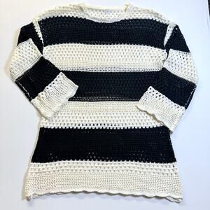 Boho Black & White Striped Crochet Knit Swimwear Cover Up Mini Dress Size Small