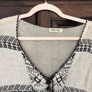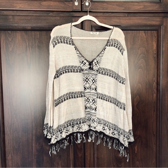 Embrace bohemian style with this chic black and cream poncho. Perfect for layering, it adds a touch of elegance to any outfit.