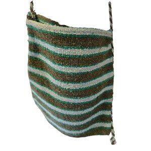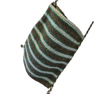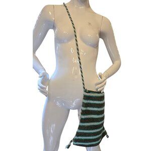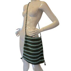 Blue and green crossbody tote. Woven with twisted strap an side details. Unlined. Good pre-owned condition. Measurements in photos.