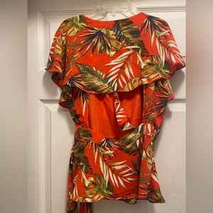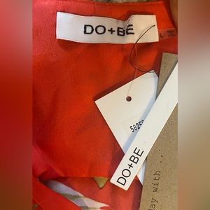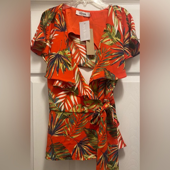 NWT DO+BE red floral wrap around blouse with back cutout. Lined. Material is 100% polyester. Size Large.