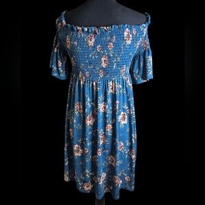 Boho Blue Floral Smocked Off-Shoulder Dress with Large Crochet Hem Sz L