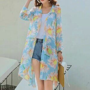 Boho style Bright Bold Yellow Daisy Floral Printed Sky Blue Semi sheer long Duster Kimono.