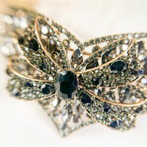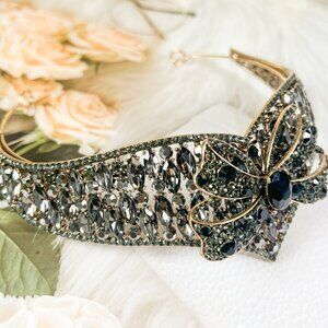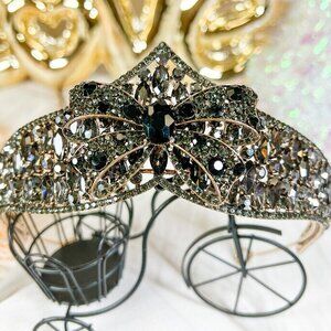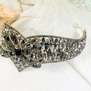 Boho Bow Ribbon Style Tiara, Gothic Black Onyx Rhinestone Crown, Hair Jewelry