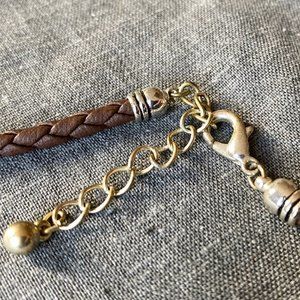 Faux turquoise and silver-tone drop pendants on braided leather cord. Lobster clasp. Adjustable.