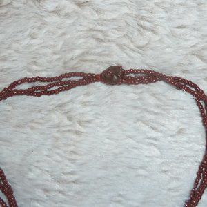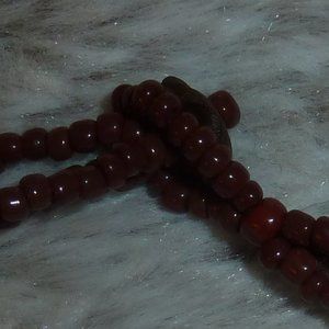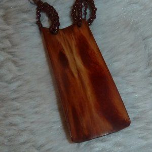 Such a nice, unique piece! Small, dark brown beads form the strands of the chain. Has a secure button closure in back. The pendant is bone or horn (not 100% sure which), light honey brown/tan in color. Slightly curved rectangle shape. Embrace a natural, bohemian style.