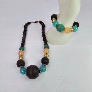 Boho Brown Turquoise Chunky Beaded Fashion Necklace Set. This unique necklace and bracelet set complements any outfit, adding a touch of flair and personality.