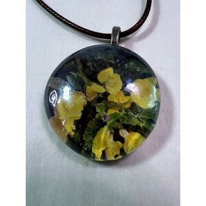 Pendant: Round dome-shaped resin pendant with real dried yellow & green flowers encased inside