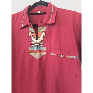 Keywords: boho shirt men mexican shirt handmade pullover vintage style woven trim burgundy top hippie festival wear artisan clothing lace up top retro bohemian embroidered details y2k southwest aesthetic baja shirt surf style indie fashion ethical fashion alternative style sustainable fashion unique menswear