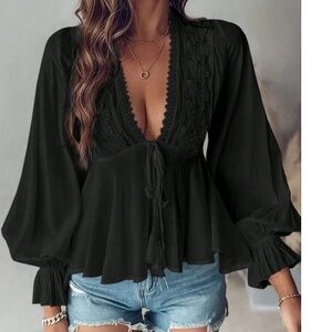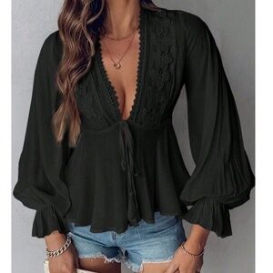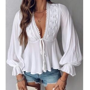 Boho Butterfly Embroidered Front Tie V neck Flounce sleeve Blouse