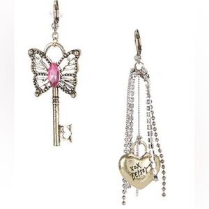 Add a playful and unique touch to your jewelry collection with these whimsical Betsey Johnson mismatched dangle earrings! One earring features a butterfly with a sparkling hot pink stone and a key, while the other showcases a dangling heart charm engraved with “XOX Betsey” and silver-tone chain strands. True to Betsey’s iconic fun and bold style, these earrings are perfect for making a statement.
