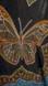 The butterfly design is on the back. Cute fringe details on the edges. Lovely ornate print all over. Resembles a stained glass pattern or mandala design
