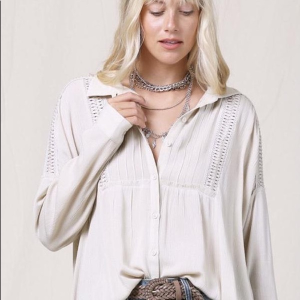 Taupe button down top with eyelet trim.