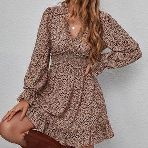 Boho Camel Dalmatian Dot V neck Ruffle Sleeve Mini Dress