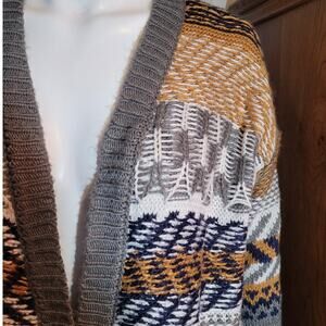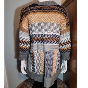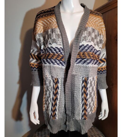Open front style. Three quarter length sleeves. Colors are gray, white, navy and camel. Good gently used condition- no damage.