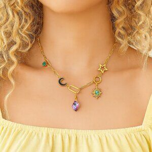 Step into a world of celestial charm with this enchanting Boho Chic necklace! Crafted from 18K gold plated stainless steel, this playful yet elegant piece features a stunning combination of symbolic charms โ a crescent moon, radiant sun, open star, and turquoise accents โ all anchored by a dazzling purple acrylic gem. Whether you're dressing up for an event or adding a magical touch to your everyday look, this necklace radiates joyful energy and individuality. A perfect gift for the free spirit, dreamer, or astrology lover in your life!