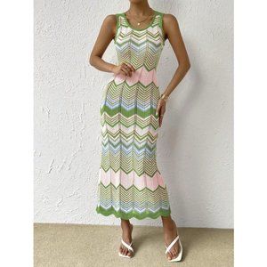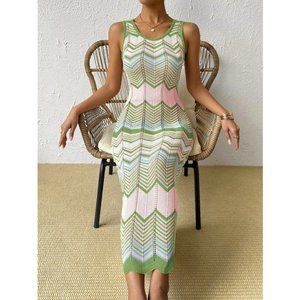 Boho Chevron Pattern Pointelle Knit Sweater Dress