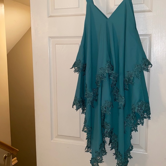 Teal Green Sleeveless Tank/Tunic. Asymmetrical Tank/Tunic Trimmed in Embroidered Lace. Never Worn.