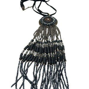 Boho Chic Beaded Necklace & Bracelet Set Statement Jewelry Black & Silver