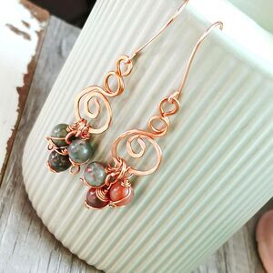 Boho Chic Bloodstone Crystal Dangle Earrings, Hammered Copper Gemstone Jewelry