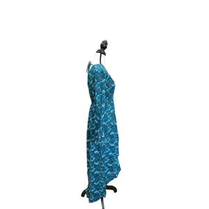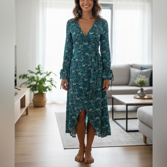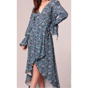 This stunning Boho chic blue floral wrap dress features a high-low hemline that adds a touch of elegance to its relaxed, flowy fit. The dress has long sleeves with tie details and a flattering V-neckline. The wrap style ensures a comfortable fit, making it suitable for various body types. Ideal for casual outings or special occasions.