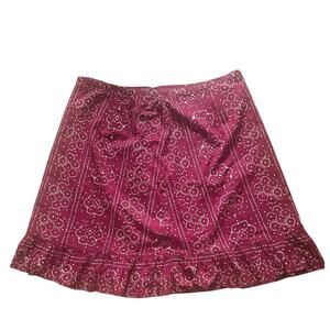 Flowy and stylish boho chic skirt perfect for festivals, vacations, and casual summer days. Deep burgundy base with metallic gold floral patterns and reflective sequin accents. Ruffle hem adds feminine movement. Zipper closure with elastic stretch at waist for comfort.