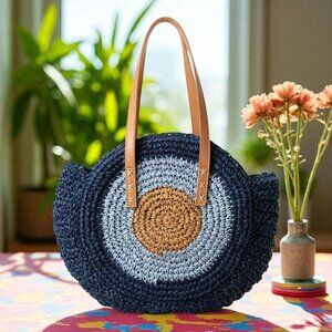 Make a bold yet breezy statement with this stunning boho chic round straw shoulder bag, designed with a vibrant coastal flair! 🌊☀️ Whether you're headed to a weekend getaway, farmers market, or brunch with the girls, this stylish woven accessory brings the perfect blend of functionality and laid-back sophistication. The circular shape creates visual interest while the rich blend of navy, tan, and soft blue tones adds effortless charm to any outfit. Lined interior with a secure zipper pocket keeps your essentials safe, and the tan faux leather handles provide a soft, comfortable grip. A must-have for lovers of all things beachy and boho! 👜💙