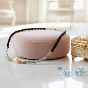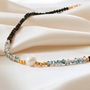 This dainty and dazzling necklace is a celebration of elegance and vibrant charm! ✨ At the heart of the design sits a luminous genuine freshwater pearl, beautifully complemented by shimmering crystals and luxe 18K gold plated stainless steel beads. The bold contrast of deep black faceted beads makes this piece an eye-catching addition to your jewelry collection. Whether you're dressing for brunch, layering for a night out, or gifting someone special, this piece brings a unique sparkle to any look. 💫