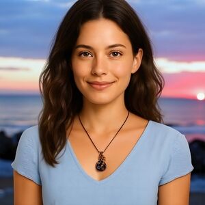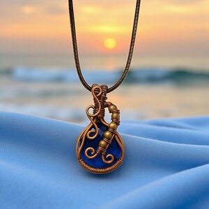 Turn heads and spark conversations with this mesmerizing artisan-crafted pendant! Featuring a genuine deep blue quartz stone that catches the light beautifully, this piece is masterfully wrapped in intricate copper wirework, giving it a rich, earthy elegance. The warm tones of the copper perfectly complement the bold blue, creating a statement look that’s as unique as you are. Whether worn alone or layered with other necklaces, it’s the perfect blend of bohemian artistry and timeless charm. Ideal for everyday wear, special occasions, or as a unique gift for someone who loves handcrafted treasures.