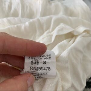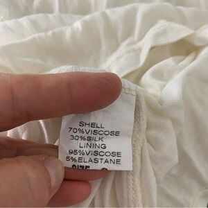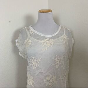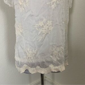 Beautiful silk blend semi sheer embroidered top with attached stretch jersey camisole. Ivory. Good preowned condition. Free of rips, holes or stains. Measured flat. Armpit to Armpit is 18.5”, shoulder to bottom hem is 23”.