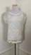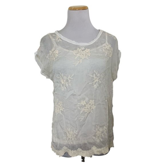 Beautiful silk blend semi sheer embroidered top with attached stretch jersey camisole. Ivory. Good preowned condition. Free of rips, holes or stains. Measured flat. Armpit to Armpit is 18.5”, shoulder to bottom hem is 23”.