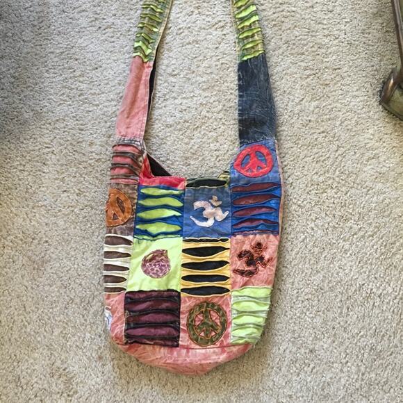 Colorful fun handbag material lined zipper closure. 15 different 4 x 4 inch textured Designs including peace signs ohms and various shapes 13"x 14 1/2" approx. long strap can be tied to make shorter. Small stain on back side see last photo.