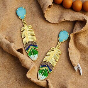 🆕️Boho Chic Feather Gemstone Earrings Gold Plated Festive Holiday Statement