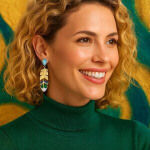 Step into fall and winter glam with these stunning boho chic feather earrings! 🍂❄️ Featuring a gold-plated zinc alloy base with vibrant enamel accents and a faceted gemstone stud, these earrings are made to stand out at any event. The feather design combines earthy green, sparkling rhinestones, and playful rainbow touches, making them a perfect blend of elegance and fun. Whether you’re dressing up for holiday parties, Christmas gatherings, or New Year’s Eve celebrations, these earrings are ready to shine. Lightweight and comfortable, they’re ideal for gifting or treating yourself to a bold seasonal accessory.