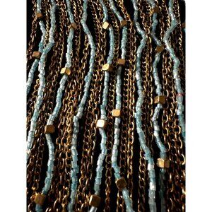 This necklace combines gold-tone chains with delicate gold color cubes and blue beads, creating a cascading fringe design. A bold accessory to enhance your outfit.