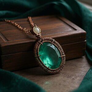 This stunning handcrafted artisan necklace combines the natural beauty of a genuine emerald and a luminous moonstone in a unique copper wire setting. The intricate wire wrapping frames the rich green emerald with a warm, earthy glow, while the moonstone adds a mystical touch with its soft iridescence. Perfect for bohemian souls, gemstone lovers, or anyone seeking a meaningful statement piece.