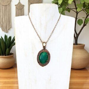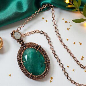 genuine emerald pendant necklace | moonstone copper wire jewelry | artisan boho chic necklace | green gemstone statement pendant | handmade wire wrapped necklace | unique gemstone jewelry gift | mystical crystal pendant | earthy bohemian accessories | emerald and moonstone jewelry | artisanal copper chain necklace | metaphysical healing stone jewelry | boho chic festival necklace | gemstone lover gift idea | copper wire handcrafted pendant | spiritual gemstone necklace | handmade boho chic jewelry | raw crystal pendant necklace | celestial-inspired jewelry | moon magic jewelry | green crystal energy piece | healing stones necklace | rustic wire wrapped jewelry | witchy vibes jewelry | layering necklace | unique jewel