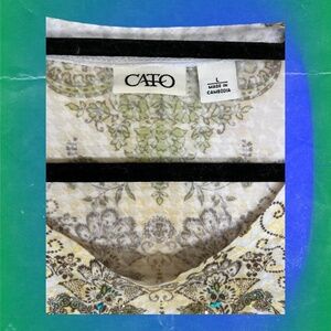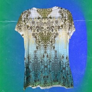 Boho Chic Graphic Tee, stylish bohemian-inspired tee, intricate floral and paisley-inspired motifs. Scoop neckline. Measurements: Bust 42 in. (21 in flat) Length 26.5 in. Size: Large Brand: Cato I do accept international shipping please message prior to discuss shipping cost. Animal friendly home: cat/dog/. SMOKE FREE Tags: #v1ntageunkn0wn #bohostyle #bohochic #fairygrunge #whimsigoth