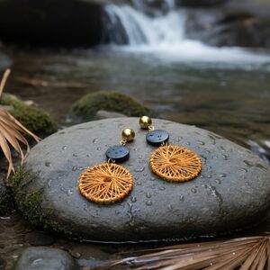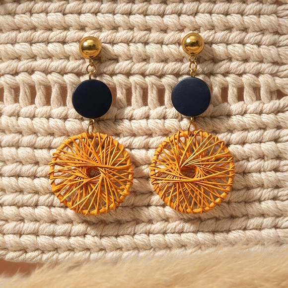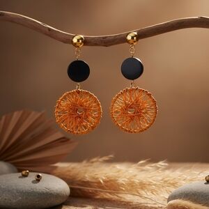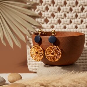Add a touch of artistry and warmth to your look with these stunning handwoven earrings! Crafted from painted metal threads wrapped into a mesmerizing spiral pattern, each pair reflects authentic craftsmanship and creativity. The navy-blue wooden disc adds depth and contrast, beautifully complemented by gold-tone details that shimmer with every movement. Lightweight and comfortable, theyβre the perfect finishing touch for any bohemian, artsy, or everyday chic outfit. Ideal for gifting or treating yourself to something truly unique! πβ¨