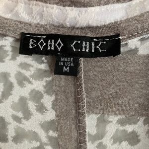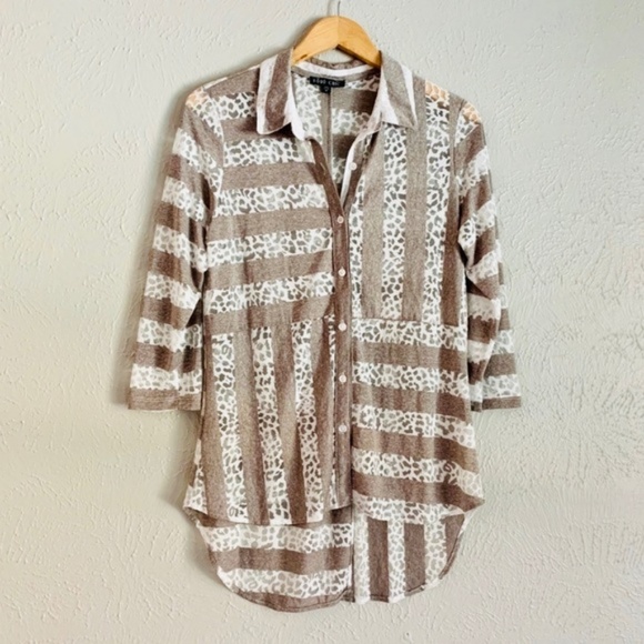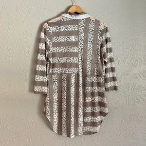 Like new! BOHO CHIC button front, 3/4 sleeve, square panel stripe tunic. High- Low hem in a white and gray abstract print with a back vent. Slightly sheer.