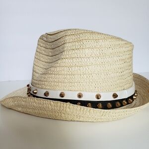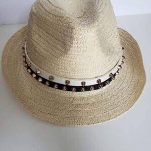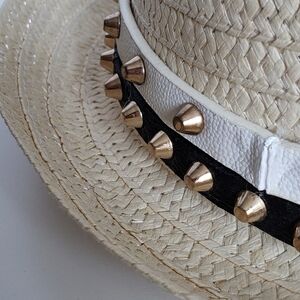Beautiful pre own hippie/boho vibes hat with black and white gold studded band. Normal wear and tear.