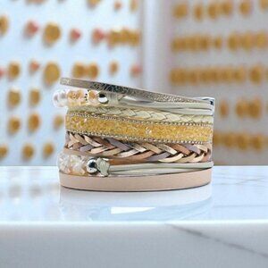 Unleash your inner goddess with this stunning Boho Chic layered bracelet! 🌟 This piece is a wearable celebration of texture and elegance—crafted with care from soft vegan leather, shimmery gold finishes, earthy woven bands, and dazzling faux pearls. The multi-layered design creates a bold stacked look without the fuss of coordinating several bracelets. Whether you're heading to a festival, brunch date, or simply elevating your everyday outfit, this bracelet adds instant charm and polish to your ensemble.
