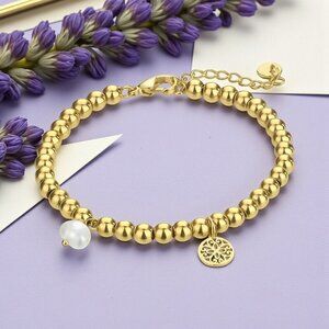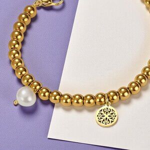 Add a touch of timeless beauty to your look with this dazzling bracelet, designed to bring together elegance, spirituality, and everyday wearability. Crafted from high-quality 316L stainless steel with a luminous 18K gold plating, this piece is hypoallergenic, tarnish-free, and built to last. The bracelet is adorned with polished gold beads, a radiant mandala charm symbolizing harmony, and a lustrous freshwater pearl for a graceful, feminine finish. Whether styled solo or layered with other favorites, this bracelet is the perfect companion for both casual and dressy looks. ๐