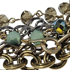 This multi-strand necklace features a sophisticated mix of gold and silver chains with shimmering beads, offering a striking accessory for elevated style.