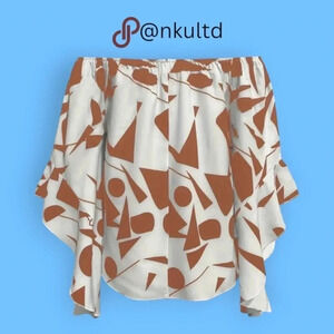 off-shoulder blouse, boho chic top, abstract print blouse, geometric pattern shirt, trendy summer fashion, flowy boho blouse, coastal resort wear, beach vacation outfit, lightweight casual top, earthy tones blouse, warm weather essential, spring and summer top, cute brunch outfit, festival-ready look, flirty off-shoulder style, feminine boho fashion, statement printed blouse, soft flowy fabric, versatile