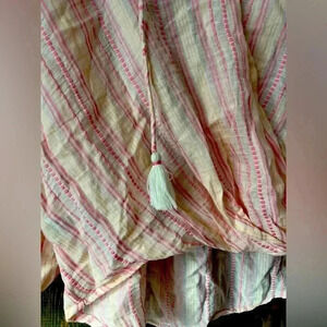 Keywords: boho, wrap blouse, pastel, striped, tassel, summer top, beach wear, lightweight, bohemian, casual chic
